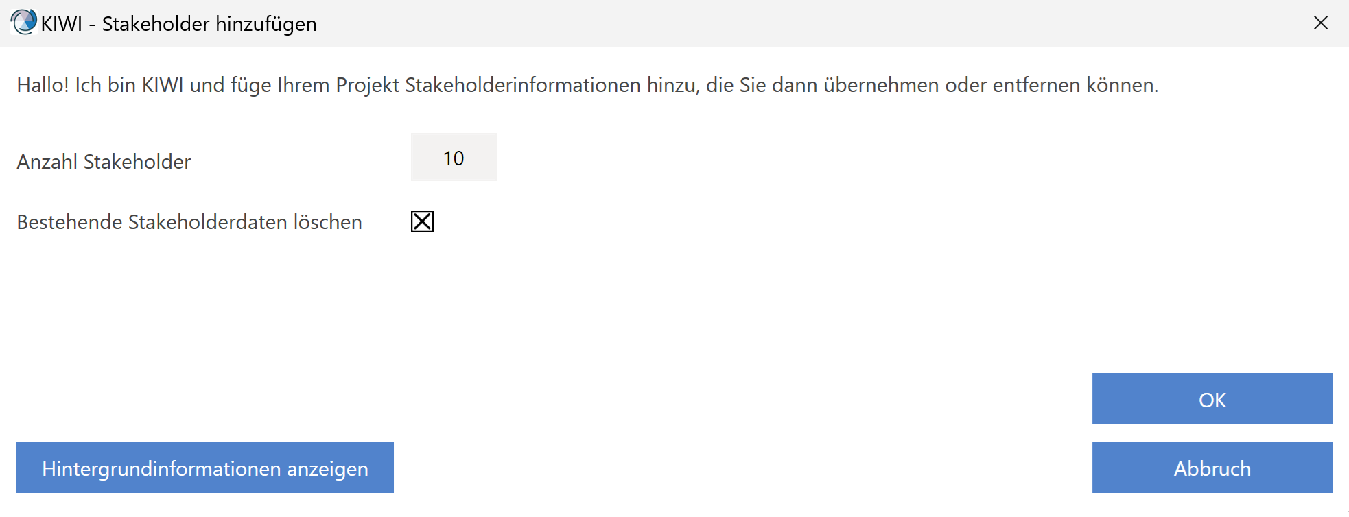 Per Mausklick öffnet sich der KIWI-Dialog, hier können sie zB die Anzahl der gewünschten Stakeholder festlegen.